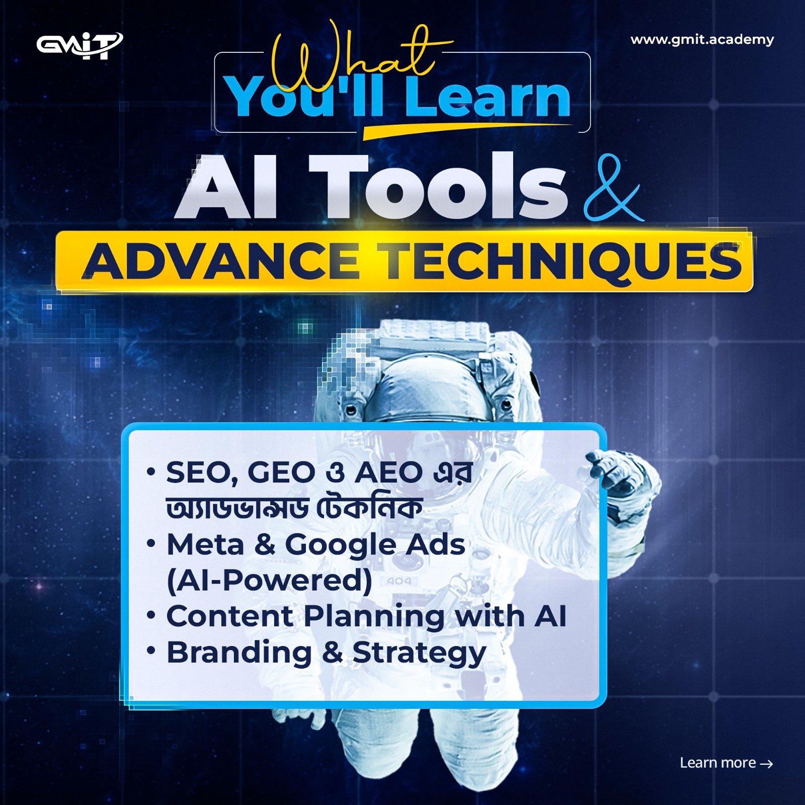 সেকেন্ডচট্টগ্রামে আমরাই প্রথম নিয়ে এসেছি ইন্ডাস্ট্রি-লিডিং AI-Driven Digital Marketing Course। শুধু SEO নয়, আমরা আপনাকে শেখাবো আগামী দিনের মার্কেটিং ট্রেন্ড GEO এবং AEO।